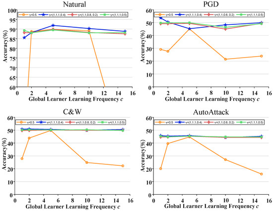 As illustrated in Figure 5, the effect of different mixing ratios on the results is significantly different, and the performance is also influenced by the learning frequency c of the global learner. In the absence of attacks, the best setting is a mixing ratio and a learning frequency . Under PGD attacks, the best performance is achieved with a mixing ratio and a learning frequency . For AutoAttack, the method performs optimally with a mixing ratio , similar to the performance under C&W attacks. Additionally, the experimental results indicate that when the mixing ratio is fixed, the method performs well only with a learning frequency , while the performance significantly degrades under other conditions. Therefore, to enhance the clean accuracy on original clean samples, the A3GT method sets the mixing ratio of the two basic learners to .