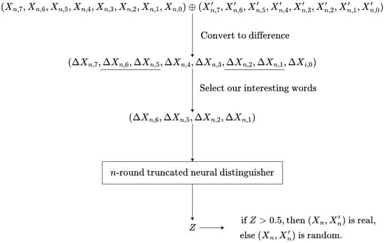 To construct a neural distinguisher that is dependent on a partial key , instead of using the entire ciphertext as input data for the neural distinguisher, we developed a new method to distinguish between real and random inputs by training on information based on partial ciphertexts. In detail, we constructed the input of the neural distinguisher using the difference for in the output word of the i-th round HIGHT round function. Since the neural distinguisher trained on this dataset uses only partial information of the ciphertext, it does not care about any information on . In addition, it means that the neural distinguisher focuses only on the difference rather than the output distribution. In other words, our intention is to train the neural distinguisher to propagate the multiple truncated differential characteristic from the input difference in terms of the differential characteristic. Accordingly, we named the neural distinguisher constructed based on this approach as a truncated neural distinguisher. Figure 3 shows an overview of the proposed truncated neural distinguisher. The detailed descriptions and rationale of the proposed neural distinguisher are in the following subsection.