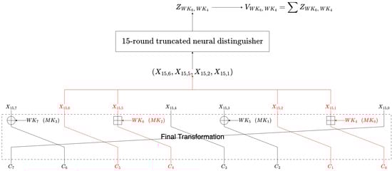 In this section, we propose a HIGHT key recovery attack using the previously constructed nine-round . In the attack described in this paper, HIGHT is reduced to 15 rounds, assuming the application of initial and final transformations. The goal is to recover used in the final transformation. Figure 5 shows an overview of the proposed attack. We expanded the nine-round truncated neural distinguisher to a fifteen-round truncated neural distinguisher by prepending a six-round differential characteristic () with a probability of (here, and ). The process of the key recovery attack based on the expanded truncated neural distinguisher is as follows: