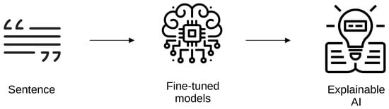 As mentioned above, this work aims to leverage multiple pre-trained LLMs to perform a text classification task. Figure 1 and Figure 2 show a simplified workflow of our approach. Specifically, we will use a labeled dataset to fine-tune the latter models to identify whether the AI or a human generated a given sentence. In addition, we used another dataset composed of papers’ abstracts created by humans and AI to differentiate the data for the fine tuning of the models. Also, using the models fine-tuned with the dataset composed of AI-generated sentences to test the effectiveness of our approach, we performed a further phase where we submitted 20 sentences generated from ChatGPT and 20 sentences randomly extracted from Wikipedia (https://www.wikipedia.org/, accessed on 8 August 2024) Finally, as shown in Figure 3, we performed a preliminary phase of explainability using the model that achieved the best results in identifying AI-generated sentences.