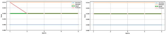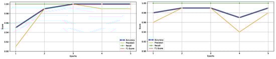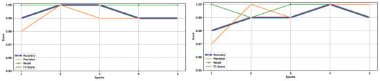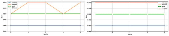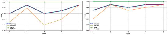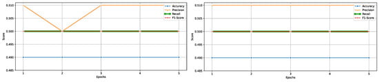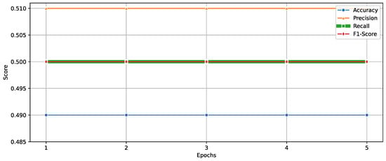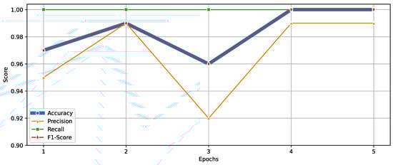 Performance metrics including accuracy, precision, recall, and F1-score across five training epochs, illustrating the models learning progression.