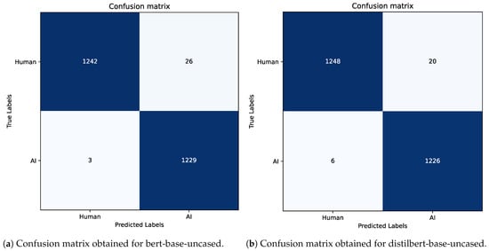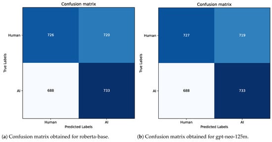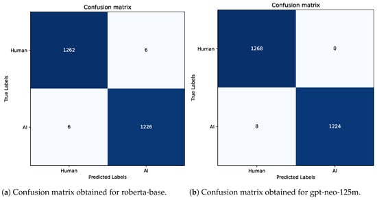 Regarding identifying sentences generated by humans and AI, Table 16 shows the different metrics extrapolated from the test set after the fine-tuning process. As can be seen, the latter fully confirms those obtained after the five training epochs. This is another confirmation that the models do not fall into overfitting but are able to manage and identify both human and AI-generated content correctly. The models that show better performance are “roberta” and “gpt-neo” since they are larger models with about 123 and 125 million parameters, respectively. Instead, Figure 12, Figure 13, Figure 14 and Figure 15 show the confusion matrices always obtained on the test set and show that overall, all models perform effectively. In fact, “electra” (see Figure 14a) found 11 false positives (phrases identified as human but generated by AI) and only 9 false negatives. A surprising result concerns the “bert” and “distilroberta” models Figure 12a and Figure 15, which predict only 3 false negatives (sentences predicted as AI-generated, but human-generated).