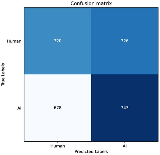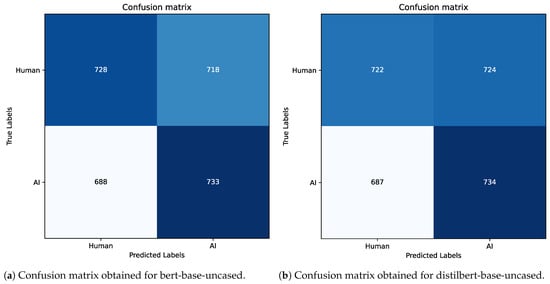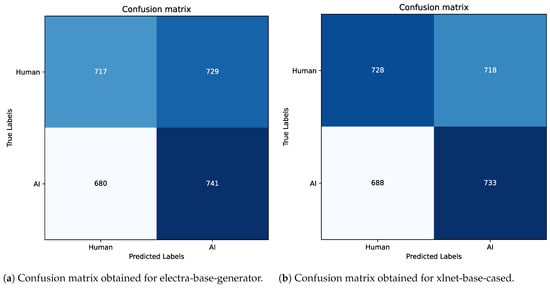 In the context of identifying the AI-generated abstract, we report the results obtained during the evaluation of the test set after the five epochs of fine tuning. Table 17 shows the details for this process, and as can be seen, the latter are not as promising as the previous. For completeness and to confirm what has been said, we also report the confusion matrices obtained in Figure 16, Figure 17, Figure 18 and Figure 19. One possible explanation for these results is that the task is more challenging than expected, and the models struggle to capture the nuances between human-written and AI-generated abstracts. The fact that these abstracts have an average length of about 191 words, with the longest abstract being 18,000 words, could contribute to the models’ poor performance. It is possible that the models are struggling to effectively process and learn from such long sequences of text, leading to suboptimal results. In addition, the learning rate, weight decay, and the number of epoch values used may not be optimal for this specific task.