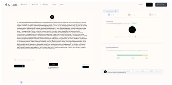 Based on the inference phase described before, we conducted an additional one, testing five random sentences generated by the AI and extracted from the dataset on the available AI detector. Specifically, we tested GTPZero (https://gptzero.me/, accessed on 19 September 2024), Crossplag (https://crossplag.com/, accessed on 19 September 2024), Copyleaks (https://copyleaks.com/ai-content-detector, accessed on 19 September 2024), and ZeroGPT (https://www.zerogpt.com/, accessed on 19 September 2024). In Table 19, we report the results obtained after this phase. As can be seen, the Crossplag AI detector is the only one able to recognize all the sentences submitted. Only Copyleaks was able to recognize the last sentence that we submitted. At the same time, ZeroGPT was not able to recognize any of the sentences because the tool needed longer sentences. Regarding Crossplag, we also found that one of the heuristics implemented is the checking for grammatical errors to distinguish human and AI content; in fact, adding extra spaces between the words in the sentence results in the tool achieving lower performance in predictions. Figure 20 and Figure 21 show screenshots of the results obtained by submitting the sentences in Table 20 to GPTZero and ZeroGPT.