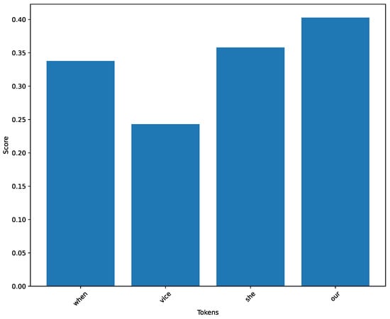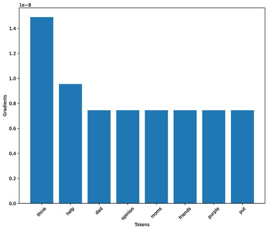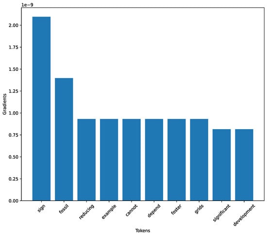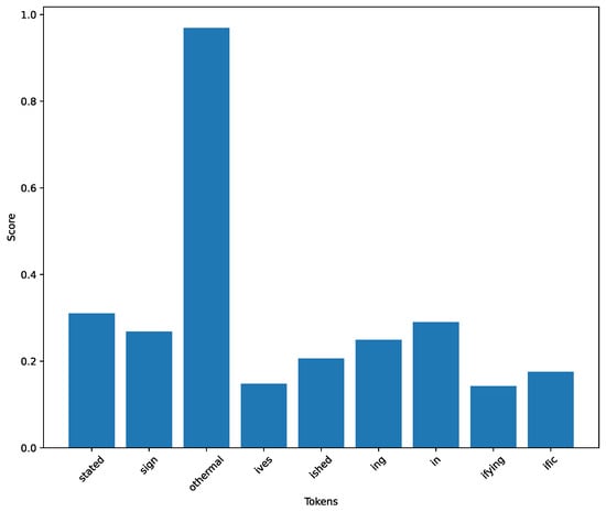 As Section 3.5 mentioned, this work leverages explainability to understand the results obtained. This study used two techniques: integrated gradients and token importance. To conduct this phase, we employed the fine-tuned version of RoBERTa in the dataset of AI-generated sentences since the model achieved the best performance on both the test set and the inference phase presented in Section 4.1 and Section 4.3. Figure 22 shows the bar chart of the integrated gradients for the AI sentence shown in Listing 2 (for the sake of brevity, we have included only a piece of the sentence). We plotted the ten tokens with the highest values, and in this case, the token “sign” mainly influenced the model prediction, which is followed by the token “fossil.” Meanwhile, Figure 23 shows the results regarding the token importance phase. As explained in the paragraph regarding the tokenization in Section 3.4, this model uses Byte-Pair Encoding (BPE) for tokenization. This subword tokenization technique helps handle out-of-vocabulary words by breaking them down into smaller ones. For this reason, the figure shows the “othermal” token, which is the subword for “geothermal” and is one of the subwords that influences most of the model about the prediction. In conjunction with these analyses, we also examined the explainability of a sentence created by a human. To perform that, we still relied on the same RoBERTa model. Figure 24 shows the results of the integrated gradients calculated on the sentence shown in Listing 3 (again, in this case, we report only a piece of this sentence) with the tokens with the highest score. Here, it is possible to note that the token “think” has the highest gradient value (), indicating a relatively more substantial influence on the model’s output than the other tokens. The other tokens, such as “help”, “dad”, and “opinion”, have lower gradient values, suggesting they contribute less to the model’s decision. Regarding token importance, where the subwords are also analyzed, Figure 25 shows that the subword “our” has a score of 0.4028, indicating a solid connection to the collective experience of seeking advice from friends or family. From Listing 3, it is possible to notice that the subword “dour” appears several times within the sentence, influencing the model’s decision.