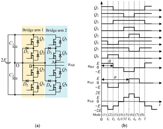 The topology of the diode-clamped five-level inverter is shown in Figure 2a, which includes bridge arm 1 and bridge arm 2. Bridge arm 1 generates a three-level voltage uBO through alternating switching of Q1–Q4 and bridge arm 2 generates a three-level voltage uAO through alternating switching of Q5–Q6. Subtracting the two three-level voltages yields a five-level output voltage uAB. Its main operating waveforms are shown in Figure 2b, where T is the operating cycle. The corresponding operating modes of the five-level inverter are analyzed as follows: