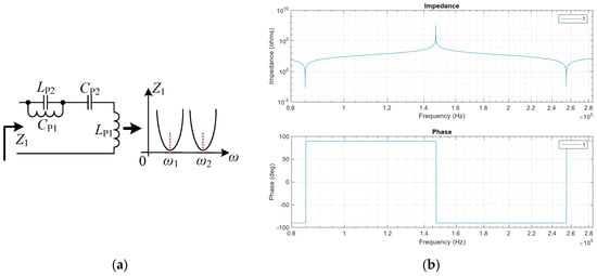 According to Equation (4), the impedance characteristics of Z1 can be plotted as shown in Figure 3b. It can be seen that Z1 has two points with minimal impedance values and zero phase, corresponding to two resonant frequencies. When the system is in resonant state, Z1 should be zero, which can be expressed as