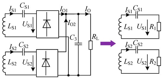In order to simplify the circuit structure, the load resistor RL is equivalent to the equivalent resistors R1 and R2 in the two receiving circuits before rectification, as shown in Figure 4, where IS1 and IS2 are the RMS values of current in the two receiving coils, US1 and US2 are the RMS values of induced voltage in the two receiving coils, IO1 and IO2 are the currents in the two receiving channels after rectification, and IO is the load current. The two receiving channels of the proposed system are connected in parallel to supply power to the load. Assuming that the output power of the two channels is P1 and P2, respectively, their expressions can be derived from Figure 4 as
