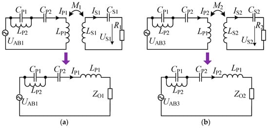 Due to the significant frequency difference between the fundamental and third harmonics, the two channels can be considered to be decoupled. Therefore, the output power of each channel can be calculated separately first, and then the total output power can be obtained by adding the two. The equivalent circuits of the fundamental and third harmonic channels are shown in Figure 5, where IP1 and IP2 are the RMS values of the transmitting coil currents in the two channels, respectively.