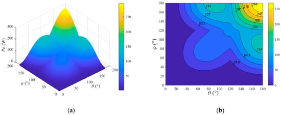 According to Equation (22), when RL, M1, M2, and ω1 are determined, PO is only related to the output voltage of the inverter, so PO can be freely adjusted by changing θ and φ. A three-dimensional graph and contour map of PO varying with θ and φ can be drawn as shown in Figure 6, where the DC input voltage is 180 V, the mutual inductance M1 is 67 μH, M2 is 22.4 μH, ω1 is 170,000π rad/s, and RL is 10 Ω. From the figure, it can be seen that, as θ and φ increase simultaneously, PO also increases and multiple different combinations of θ and φ can produce the same PO, indicating that the controllability and degree of freedom of the system output power are very high.