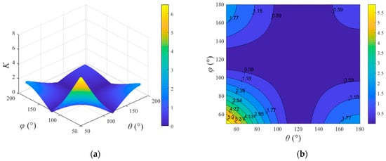 Variation in K with θ and φ. (a) Three-dimensional graph; (b) contour map.