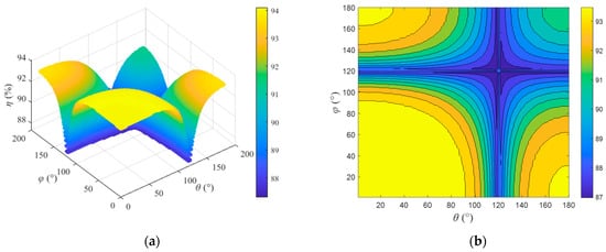 According to Equation (29), the three-dimensional graph and contour map of η varying with θ and φ can be obtained as shown in Figure 8. Based on the analysis of Figure 6 and Figure 8, it can be seen that, under the same output power, the system efficiency will vary with different θ and φ. Therefore, it is necessary to select appropriate operating points of the inverter to ensure that the system operates in an optimized state.