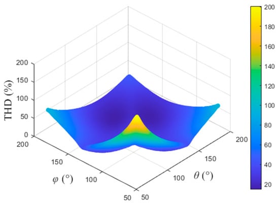 According to Equation (30), a three-dimensional graph of the inverter output voltage THD as a function of θ and φ can be drawn as shown in Figure 9. It can be seen that, the larger the θ and φ, the lower the THD; otherwise, the THD will be higher. When the THD is high, the output voltage of the inverter not only contains rich third harmonic, but also increases the content of fifth, seventh, and higher harmonics.