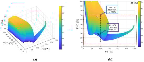 Based on the above analysis, a three-dimensional graph of the relationship between system output power, system efficiency, and inverter output voltage THD can be further drawn as shown in Figure 10a. It can be seen that, within the entire output power range, the higher the efficiency, the higher the THD, indicating that the two are contradictory. At low power levels, the THD is high and may interfere with the safe operation of the system. In order to improve the power transmission quality and ensure the safe operation of the inverter and other power electronic devices, the selection rules for the optimal operating points of the inverter are as follows: When the output power is low, the point that the THD is not exceeding 70% and the efficiency is highest is selected as the operating point of the inverter. When the output power is high, it can be seen that the maximum THD value is below 70%. At this time, the point with the highest efficiency is directly selected as the operating point of the inverter, which is the part in the red box in Figure 10b. Taking an output power of 100 W as an example, as shown in points G1 and G2 in the figure, the output power is the same and the THD is within 70%. The system efficiency at point G1 is 90.2% and the THD is 30%, while the system efficiency at G2 is 92.8% and the THD is 70%. Therefore, G2 is selected as the optimal operating point of the inverter at an output power of 100 W.
