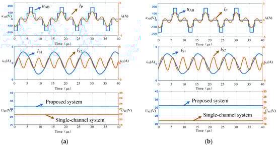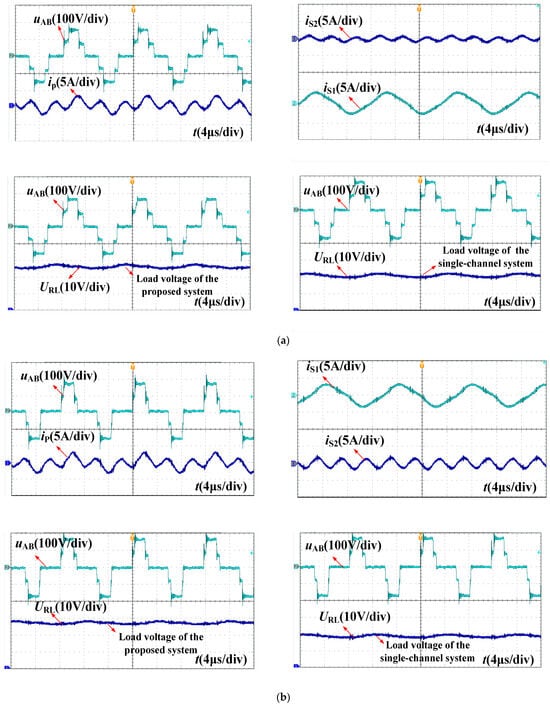 The experimental waveforms are shown in Figure 14, where Figure 14a is the experimental waveforms at operating point G1. The inverter output voltage is a five-level waveform with a maximum amplitude of 180 V. The inverter output current is composed of fundamental and third harmonic components. iS1 and iS2 are the receiving currents of the fundamental and third harmonic channels, respectively. Due to the low third harmonic component in the inverter output voltage, iS1 is significantly higher than iS2. The experimental results are consistent with the simulation. At the same time, the load voltage waveforms of the proposed system and the traditional single-channel WPT system are measured separately. Under the same input DC voltage, the output power of the proposed system is significantly improved compared to the traditional single-channel WPT system. Similarly, Figure 14b shows the experimental waveforms at the operating point G2, which are consistent with the simulation results. The system output power has been significantly improved, and the improvement effect is consistent with the theoretical analysis and simulation results.