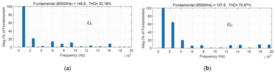 According to the analysis results in the previous section, at operating point G1, θ and φ are set to 67 ° and 152 °, respectively. At operating point G2, θ and φ are set to 57 ° and 164 °, respectively. The simulation waveforms are shown in Figure 11, where (a) is the simulation waveforms at operating point G1 and (b) is the simulation waveforms at operating point G2. It can be seen that the inverter can generate different five-level output voltages under different modulation parameters. The output current of the inverter is mainly composed of fundamental and third harmonic components. The receiving currents of the fundamental and third harmonic receiving channels are both sine waves and their frequencies differ by three times. Under different modulation parameters, the fundamental and third harmonic contents of the inverter output voltage are also different, so the magnitude of the receiving current values in the fundamental and third harmonic receiving channels also varies. The figure also shows the load voltage of the proposed system and the load voltage of the traditional single-channel WPT system. It can be seen that the system output power is improved to a certain extent under two different operating points. The higher the third harmonic content, the more pronounced the power improvement, but it can also affect the THD of the inverter output voltage. The THD of the inverter output voltage at two operating points is shown in Figure 12, which is consistent with the theoretical analysis.