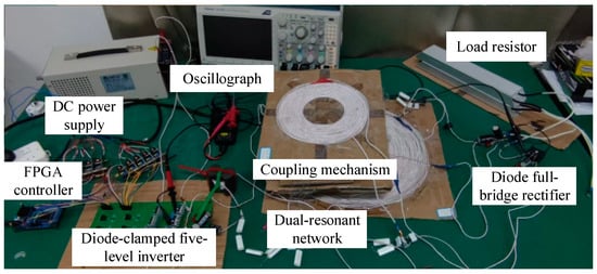 In order to verify the superiority and effectiveness of the proposed method for boosting the system output power, an experimental setup, as shown in Figure 13, is constructed based on the system parameters in Table 1. The experimental setup mainly consists of a DC power supply, an FPGA controller, a diode-clamped five-level inverter, a dual-resonant network, a coupling mechanism, two diode full-bridge rectifiers, and a load resistor. The FPGA controller is used to generate driving signals to control Q1–Q8 MOSFET power switches. The coupling mechanism has two receiving coils on either side of the transmitting coil to reduce cross coupling between the two.