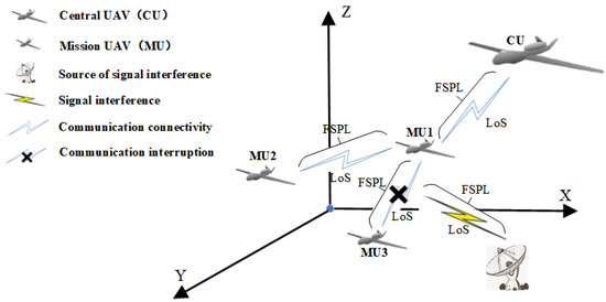In the above equations, represents the minimum SNR threshold required for normal communication, is the transmission power (in db) of the CU’s wireless signal, signifies the calculation of the maximum communication interference within a rectangular area defined by the CU’s position and the target MU’s position considering all grid regions within this rectangle, and and respectively represent the maximum average path loss and the maximum normal communication distance between the CU and any MU after , and have been determined, while the process for calculating the maximum normal communication distance between any pair of MUs follows the same methodology. The communication status among HUAVs is illustrated in Figure 2.