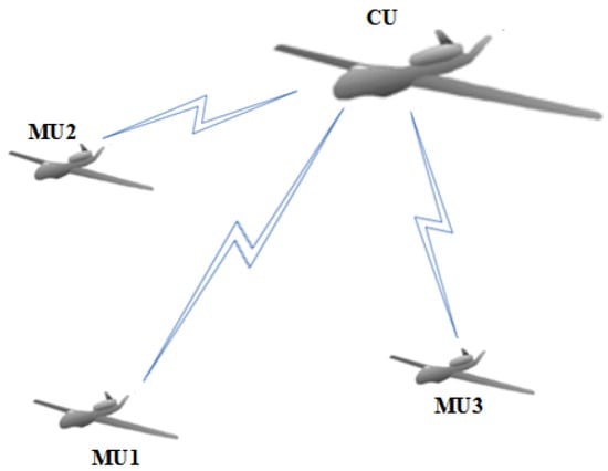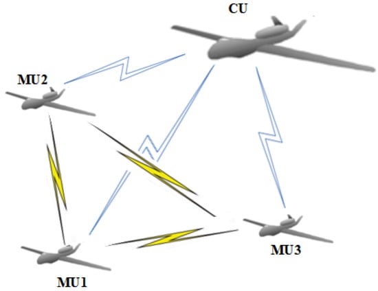 The control architecture of an HUAV swarm plays a decisive role in its flexibility and operational effectiveness. By fusing the attributes of centralized and decentralized architectures, centralized–distributed architectures mitigate the shortcomings of both while amplifying their respective strengths. As illustrated in Figure 5, a distributed system is established among MUs, while a CU is responsible for centralized management and global information sharing. Each UAV is able to not only share information in real-time but also to autonomously operate in a distributed mode, achieving an optimal balance between centralized control and decentralized execution.