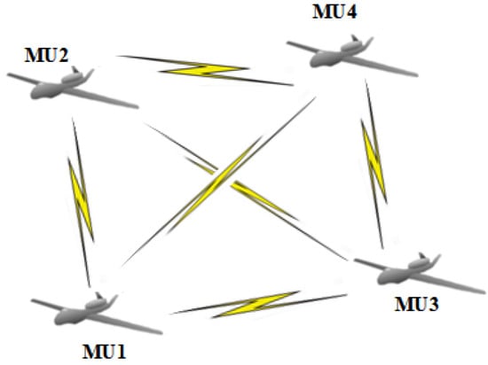 In a distributed architecture, each UAV possesses independent decision-making capabilities, fostering collaboration within the swarm and enhancing robustness and adaptability. However, this advantage is accompanied by increased information processing burdens and potential resource wastage issues. In an environment with unknown communication interference, communication between the UAVs in a distributed system is susceptible to disruption, hindering information sharing and exacerbating inefficient resource utilization. As depicted in Figure 4, this architecture lacks a CU, with each MU executing missions independently based on available information.