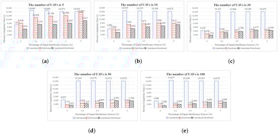 Comparison of mission completion times for HUAV swarms based on different architectures. (a) The completion time for mission with 5 UAVs. (b) The completion time for mission with 10 UAVs. (c) The completion time for mission with 30 UAVs. (d) The completion time for mission with 50 UAVs. (e) The completion time for mission with 100 UAVs.