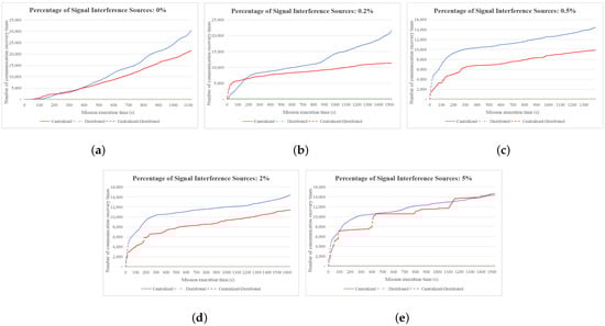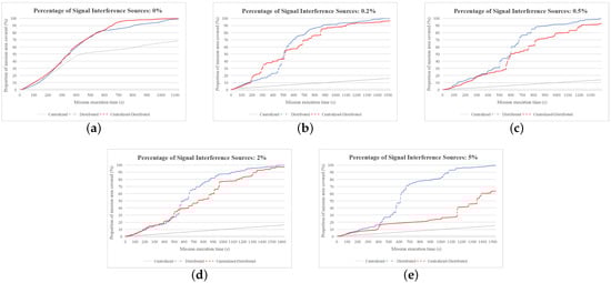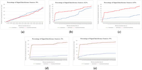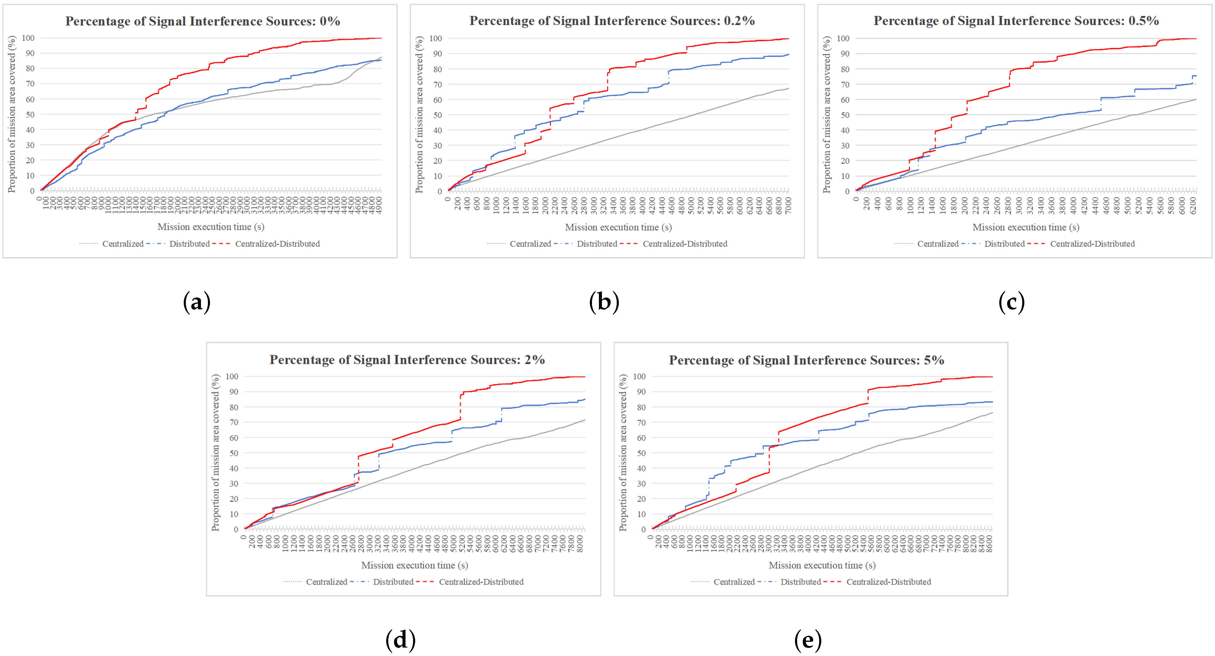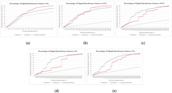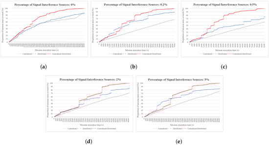 Figure 9 demonstrates that with an HUAV swarm size of 100, the centralized–distributed architecture offers an advantage over the distributed architecture solely when there are no signal interference sources (0%). When the number of signal interference sources increases to 0.2%, 0.5%, 2%, and 5%, a pronounced disparity in coverage speed emerges between the centralized–distributed and distributed architectures. Notably, the speed of the HUAV swarm with the distributed architecture intensifies with the proliferation of signal interference sources, echoing the trend observed for the centralized–distributed architecture. Again, the centralized architecture exhibits anomalous behavior, with its mission execution speed staying uniform and markedly slower than the other two architectures except in the absence of signal interference sources in the mission area.