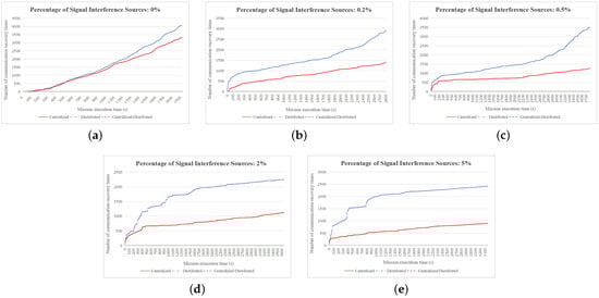 To investigate the number of communication recoveries after disruptions during regional coverage missions executed by HUAV swarms under varying signal interference intensities and swarm sizes, we conducted simulation analyses with different proportions of signal interference sources at 0%, 0.2%, 0.5%, 2%, and 5% and with HUAV swarm sizes of 5, 30, and 100. A comparison of communication recovery times for reconnaissance and coverage missions performed by HUAV swarms based on centralized, distributed, and centralized–distributed architectures is presented in Figure 10, Figure 11 and Figure 12.