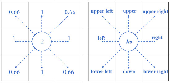 As indicated by the model, when the pheromone diffuses from a grid center to different regions, the pheromone diffusion value can be calculated using Equation (12):