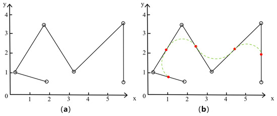 (a) Path locus point (b) Cubic B-spline smoothing. The hollow dots represent the inflection points, the solid red dots represent the midpoints and dashed lines represent paths.