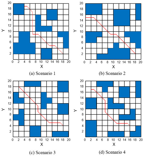In this context, represents the i state of the random system, and represents the probability of the occurrence of state . When each state is closer to each other in terms of outcome, it indicates a higher value of information entropy, which suggests that the controlled initial number and location of the ant colony are better. Conversely, when the difference in calculated probability values among states is greater, it indicates a lower value of information entropy, indicating that the controlled initial number and location of the ant colony are poorer.