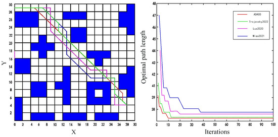 According to the experiments, the following observations can be made: (1) Compared with the state-of-the-art algorithm in paper [33], the algorithm proposed in this paper saves 7.8 m in path length with a 16.5% improvement under the same parameter settings. In terms of convergence speed, the proposed algorithm begins to converge after the 10th iteration, while the algorithm in paper [33] starts to converge after the 38th iteration, demonstrating a significant 73.6% improvement in convergence speed. (2) When compared to the algorithm in paper [34], the path length is reduced by 4.8 m, achieving a 10.9% improvement. Regarding the number of iterations to convergence, the proposed algorithm converges at the 10th iteration, whereas the algorithm in paper [34] converges at the 20th iteration. Thus, the convergence speed of the proposed algorithm is notably better than that of paper [34], with a 50.0% improvement. (3) Finally, when compared to the pelican optimization algorithm (POA), under the same parameter settings, this paper saves 2.4 m in path length, which is a 5.7% improvement. In terms of convergence iterations, the proposed algorithm begins to converge after the 10th iteration, while the POA algorithm starts to converge after the 12th iteration. The proposed algorithm is slightly better than the POA, with a 16.6% improvement. Relatively, the overall performance of the algorithm in paper [34] is superior to that of paper [33]. Both paper [34] and POA algorithms are slightly inferior to the proposed algorithm in this paper in overall performance, but they outperform the other two algorithms in comparison. In summary, the method proposed in this paper exhibits superior convergence capabilities compared to the comparative methods. Additionally, in terms of optimal path comparison, the method proposed in this paper also shows a slight advantage over the comparative methods, thereby validating the overall performance superiority of the proposed method.