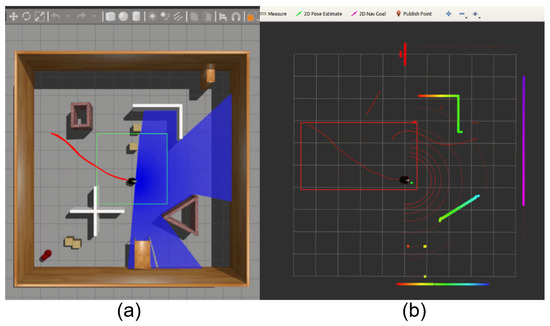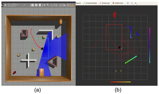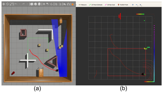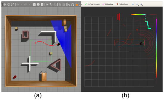 The network architecture for both algorithms includes a policy network and a Q-network, each consisting of three fully connected layers with ReLU activation functions. The policy network’s input layer receives state information, and its output layer generates action probabilities. For the Q-network, the input layer processes state–action pairs, while the output layer estimates Q-values. The hidden layers of both networks contain 256, 128, and 64 neurons, respectively. Additionally, target networks for both the policy and Q-networks are employed, with weights updated periodically using a soft update mechanism with a coefficient of 0.005. The training of the ADACO-ATD3 network was conducted in an environment built within the Gazebo simulation software (Gazebo 9). The maximum linear velocity of the robot was set to 1 m/s, and the maximum angular velocity was set to 1 rad/s. Figure 6, Figure 7, Figure 8 and Figure 9 depict the test results after training. Figure 6a, Figure 7a, Figure 8a and Figure 9a show the simulation environment gazebo, which corresponds to Figure 6b, Figure 7b, Figure 8b and Figure 9b, which is the data visualization interface rviz. The red dotted line in the box indicates that in the autonomous navigation test based on the trained model, the car can start from a random starting position autonomous navigation to a random end location with a smooth resulting path.
