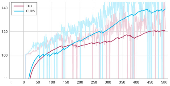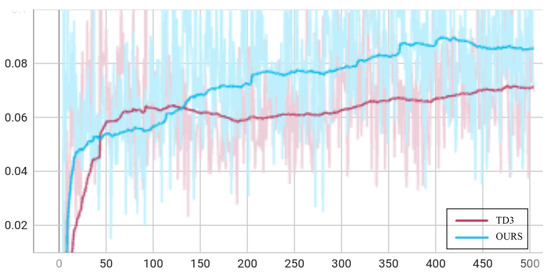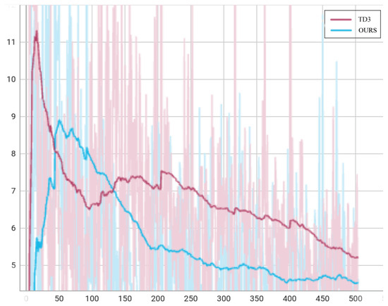 As can be seen from Figure 10, the loss curve of our proposed method (shown in blue) starts from a relatively low loss value. Over time, the downward trend of the curve indicates a gradual improvement in model performance. The stabilization of the curve at the end suggests that our model has reached the point of minimal improvement and converged. The smoother downward trend exhibited by the loss curve of our method compared to the TD3 loss curve (shown in purple) implies a smaller performance variation across iterations. In contrast, the TD3 loss curve starts from a higher loss value and demonstrates a more significant downward trend in the early stages. Compared to the model curve of our method, the TD3 curve exhibits sharper fluctuations in loss, indicating greater volatility. The comparison of the loss curves reveals that our method starts with a lower initial loss and exhibits a smoother decline, indicating its higher efficiency and better performance than TD3 in this training scenario.