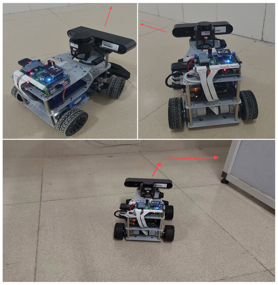 In the practical experiment, we deployed an Ackermann mobile robot that is powered by a microcomputer core, specifically the Jetson Orin Nano 4G, running on the Ubuntu 20.04 operating system to execute autonomous navigation programs with precision. For environmental object recognition, it is fitted with a Leishen N10P lidar sensor and an Astra_s stereo depth camera, both manufactured in Shenzhen, China. Furthermore, we utilized a laptop computer operating on Ubuntu 18.04, enhanced with an NVIDIA RTX 3060 graphics card, 16 GB of RAM, and an AMD Ryzen7 5800H CPU, designed in Sunnyvale, CA, USA. This laptop served as a remote monitoring and control hub for the mobile robot, ensuring efficient supervision and management of the robot’s operations.