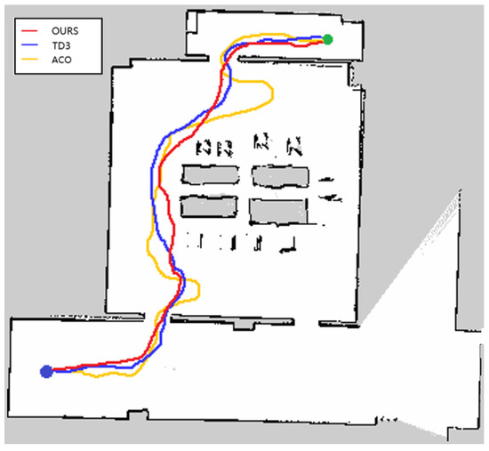 Figure 15 displays a comparison of the autonomous navigation paths of our method versus other approaches in a real-world environment. In this setting, all methods successfully reached the global target point, but differences were observed in the travel path lengths and the time taken. Our method efficiently reaches the global target while minimizing travel distance. The TD3 algorithm, while similar in distance to our method, has lower learning efficiency, leading to longer execution times. Additionally, the ACO algorithm’s path is longer and more convoluted, which contributes to its extended travel times. Table 3 presents the detailed experimental data.