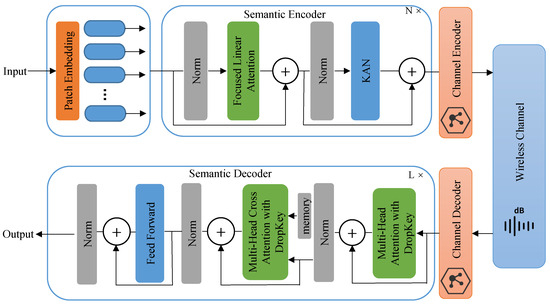 In addition, in each layer of the semantic encoder, normalization is performed before the FLA and KAN modules, with the number of layers . Subsequently, the channel encoder performs channel encoding on , generating the transmitted signal .