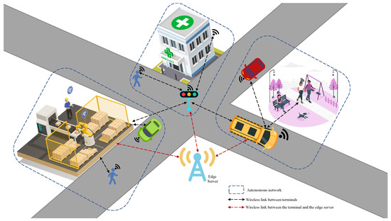 In this scenario, the computing devices are classified into three categories: edge servers, PTs, and secondary terminals (STs). As shown in Figure 2, the terminals transmit task-related raw data and processed semantic information through wireless links. It is important to note that STs cannot communicate directly with each other. Computing terminals can either be fixed devices (such as computational routers) or mobile devices such as personal smart devices (with low mobility) or vehicles (with high mobility). During each time slot , the PT senses the status of its ACPN and generates a semantic task. It then decides which terminal to offload the task to, based on the computational resources available in both its own ACPN and other ACPNs.