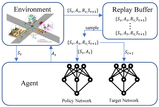 The DQN-based terminal-side semantic task offloading algorithm architecture is shown in Figure 3. Q-function represents the long-term reward obtained by taking a specific action in a particular state. DQN uses a Deep Neural Network (DNN) to approximate the Q-function. The DNN accepts the state as input and outputs the Q-values for each possible action. The agent consists of a policy network and a target network, both implemented as a multi-layer perceptron. The policy network is responsible for selecting the optimal action based on the current state, while the target network serves as a copy of the policy network, with its parameters periodically updated to match those of the policy network to enhance training stability. In time slot , the agent interacts with the environment to obtain the current state . is fed into the policy network to obtain the predicted Q-values for all actions, and the action with the highest predicted Q-value is selected. The environment executes the action and provides a reward , while updating the state to . A state transition sequence is generated and stored in the experience replay buffer. The agent randomly samples a mini-batch of transition sequences from the buffer and inputs them into the policy network and target network to obtain the predicted Q-values and target Q-values. The MSE is used as the loss function to update the parameters of the policy network. After a fixed number of episodes, the parameters of the target network are updated with the real-time parameters of the policy network. The target Q-value is calculated as shown in Equation (27).