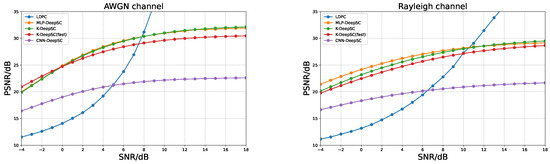 To evaluate the performance of the proposed model in the image-reconstruction task, we conducted simulation tests under AWGN and Rayleigh channels at SNR levels ranging from −4 to 18 dB, focusing on its PSNR performance. Both the CNN-DeepSC and MLP-DeepSC models were trained at an SNR of 12 dB. The simulation results are shown in Figure 4, and the model parameter sizes are presented in Table 2. As shown in Figure 4, the proposed K-DeepSC and K-DeepSC(fast) models achieve comparable performance to MLP-DeepSC, while the required parameters are reduced by almost 44%. Although CNN-DeepSC has the least number of parameters, its limited ability to capture global information results in suboptimal performance. In contrast, under poor channel conditions (e.g., SNR < 4 dB), traditional syntax communication exhibits very low PSNR values, rendering effective image reconstruction impossible. However, the proposed K-DeepSC semantic communication system, with fewer model parameters, is less affected by the channel signal-to-noise ratio, maintaining a high PSNR even under extremely adverse channel conditions.