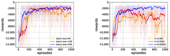 Batch size and learning rate are crucial hyperparameters in DQN. Figure 5 illustrates the impact of different batch sizes and learning rates on the convergence of the DQN algorithm. From the figure, it can be observed that when the batch size is set to 256, the algorithm achieves a higher reward and begins to converge after approximately 100 episodes, while with a batch size of 128, convergence only starts around 200 episodes. When the learning rate is set to 0.002 and 0.0002, the convergence curves exhibit significant fluctuations, indicating that the learning rate is too high, leading to large updates in the network parameters and causing instability in the Q-value estimates. However, when the learning rate is set to 0.00002, the curve is relatively stable, and the algorithm successfully converges. Therefore, we set the batch size of DQN to 256 and the learning rate to 0.00002.