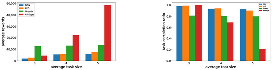 Figure 7 illustrates the impact of task size on rewards and completion rates. From the figure, it can be observed that, except for the greedy algorithm, the rewards of other algorithms gradually decrease as task size increases. Task size changes have minimal impact on the greedy algorithm. This approach, which overlooks the reliability of inter-terminal communication and prioritizes offloading tasks to terminals with lower loads, ultimately results in decreased task completion rates. Consequently, this leads to penalties and lower rewards. In contrast, the rewards of the DQN algorithm outperform those of the PPO algorithm across different task sizes. In the scenario where all tasks are offloaded to the edge server, the rewards significantly decline with increasing task sizes. This is due to the impact of task size on transmission times, which prevents meeting latency requirements and increases penalties. Figure 4 also shows the influence of different task sizes on task completion rates. Both the DQN and PPO algorithms maintain completion rates close to 1 across all task sizes, while the greedy algorithm’s completion rate stabilizes around 0.8. In contrast, the scheme of offloading all tasks to the edge server experiences a sharp decline in completion rates for larger tasks, eventually maintaining only around 0.2.
