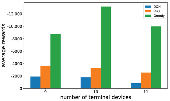 Figure 8 illustrates the impact of the number of terminals on rewards. Since the variation in the number of terminals has no significant effect on the latency of offloading all tasks to the edge server, this comparison focuses only on the DQN, PPO, and Greedy algorithms. In the DQN algorithm, as the number of terminals increases, more tasks can be offloaded to the terminals for processing, thereby reducing the overall processing latency. The rewards of the PPO algorithm increase slightly with the increasing number of terminals, but its performance still lags behind that of the DQN algorithm. The greedy algorithm tends to offload tasks to terminals with lower loads. When the number of terminals is 9, the greedy algorithm offloads some tasks to the edge server, which improves the task completion rate and slightly increases its rewards. Meanwhile, when the number of terminals increases to 11, the reduction in the task queue leads to decreased queuing latency, resulting in a slight improvement in the rewards compared to when there are 10 terminals. Nevertheless, overall, the performance of the greedy algorithm still shows a significant gap compared to the DQN algorithm.