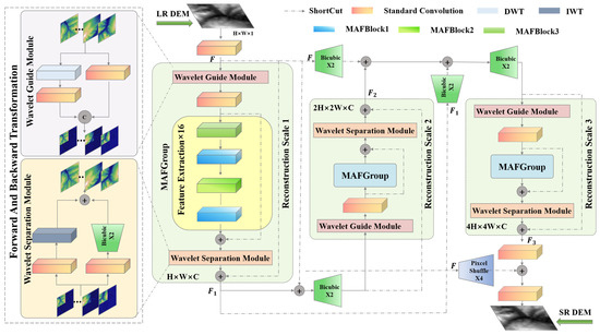 The DDMAFN structure is illustrated in Figure 1. The DDMAFN consists of a series of identical reconstruction sub-networks, each responsible for feature extraction and fusion at specific scales, aiming to incrementally achieve super-resolution reconstruction of low-resolution (LR) DEM data. To ensure the correct fusion of original features or output features from previous sub-networks at each key output node, a bicubic upsampling method is employed at the residual joints, except for the final reconstructed super-resolution (SR) DEM. The input LR DEM is converted into the original input feature map via convolution operation, which then enters the wavelet guidance module of the first reconstruction sub-network. In this module, the feature map is processed in both wavelet and spatial domains to capture more comprehensive image features. Next, the convolutionally processed feature map is fed into the MAFGroup with a cascade of 16 MAFBlock, fused with the convolutional feature map through residual links to enhance feature extraction and representation. Then, the feature map is further optimized and separated by the wavelet module. The optimized feature map is fused with the original input feature map to complete the first sub-network reconstruction. Entering the second reconstruction sub-network, the output of the first sub-network is fused with the original input feature map and upscaled for finer feature extraction. This sub-network repeats the feature extraction process of the first sub-network. The original input feature map and the output of the first sub-network are upscaled and fused with the output of the second sub-network to form a richer feature representation. Before entering the third sub-network, the original input feature map and the outputs of the first two sub-networks are upscaled, and feature fusion is performed to further integrate information at different scales. Finally, the output feature maps of the third sub-network are fused and convolved with the original input feature maps filtered by the Pixcelshuffle upsampling method four times to obtain super-resolution (SR) DEM results. This process enhances the resolution and detail of the DEM image through cross-scale feature fusion and gradual zoom-in strategy, obtaining SR results at multiple scales simultaneously.