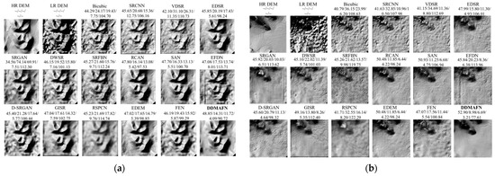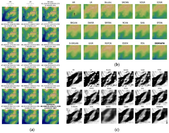 In the DEM SR task, HMA data served as the HR dataset, while GDEM data was used as the LR dataset. Table 1 shows that the bicubic interpolation method yields poor results in terms of PSNR, RMSE, and MAE. SRCNN, VDSR, and EDSR outperform bicubic interpolation across all metrics, demonstrating the effectiveness of deep learning in DEM SR tasks. Among the models involved tested, DDMAFN demonstrates the best performance. Additionally, DWSR, RCAN, SAN, SRFBN, EFDN, FEN, and EDEM also show outstanding performance. Their PSNR values range from 45.97 to 49.10, RMSE values from 14.25 to 20.51, and MAE values from 10.96 and 15.71. Although these models perform slightly lower than that of DDMAFN, they still significantly improve over the bicubic interpolation methods. Notably, GAN-based methods (e.g., SRGAN, D-SRGAN, and GISR) have relatively low PSNR. This may be because GAN methods focus more on the visual quality rather than faithfully reproducing original image details. Compared to the Bicubic method, DDMAFN improves in all three metrics. DDMAFN has a 21.35% higher PSNR than bicubic. Bicubic’s RMSE is 2.63 times higher, and its MAE is 2.98 times higher than DDMAFN’s. Table 1 illustrates that RCAN, EDEM, and DDMAFN perform excellently in slope and aspect errors. Specifically, DDMAFN achieves and values of 4.15° and 111.47° respectively.