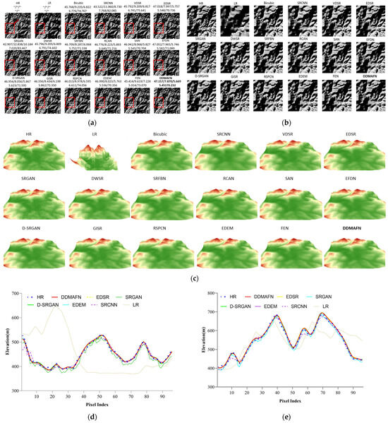 Figure 4a displays the hillshade maps generated by 16 models for the DEM SR results, while Figure 4b provides a zoomed-in view of a partial area of the hillshade. Figure 4c presents a 3D visualization of the red-marked region, while Figure 4d and Figure 4e display graphs of the cross-section containing 11 rows and 13 columns, respectively. Generally, the 16 models can produce terrain features that closely resemble the HR data, indicating a high level of reconstruction capability. However, in some of the regional observations, we observed that the LR maps lacked topographic information, making it challenging to discern topographic details compared to the HR data. Comparing the hillshade maps of these 16 models, we observe that the Bicubic method better maintains the basic morphology consistent with the HR data, although significant differences exist in the details of the hillshade. The morphology differences between the SRCNN method and the HR data are considerable, with many fine-grained features left unrevealed. While the VDSR method excels in fine-grained features, it generates numerous pseudo-topographies compared with the HR hillshade maps, affecting the reconstruction accuracy. The EDSR method has similar issues, along with the EDSR, SRGAN, SRFBN, D-SRGAN, and GISR methods, which suffer from the mesh texture problem, further deteriorating the reconstruction quality. Furthermore, the false texture generated by the SAN method on the left side is a notable issue. The hillshade maps generated by EDSR, RCAN, EFDN, EDEM, and DDMAFN closely resemble the HR data and exhibit relatively better reconstruction quality. While they may not perfectly capture the features of the fine-grained terrain on the upper left side, these three methods effectively represent terrain features close to the HR data and demonstrate high reconstruction accuracy, especially in the high mountain part on the lower right side. Three-dimensional visualization (Figure 4c) further validates the DDMAFN model’s performance across diverse terrains, with reconstructed terrains closely resembling the actual high-resolution data in morphology and texture. A comparison of cross-section plots (Figure 4d,e) reveals that super-resolution models deviate at sharp elevation changes, while in flat regions with gradual changes, all models accurately fit the DEM HR curve. In contrast, the DDMAFN model fits the DEM HR curve more precisely, highlighting its superiority in detail preservation.