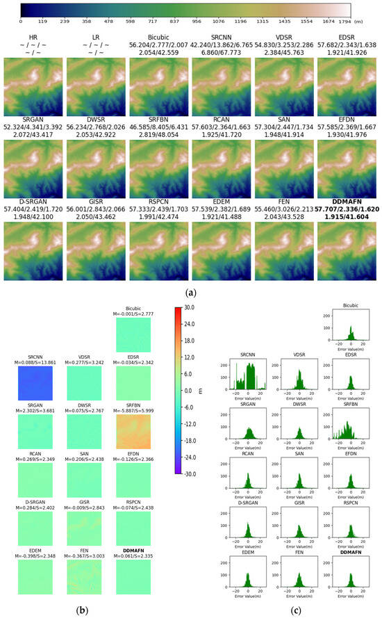 2× SR results for the baseline model and DDMAFN on SRTM data. (a) is the SR results. (b) is error maps for HR-SR. (c) is the histogram of the error data.
