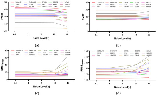 Comparison of model performance under varying noise intensities. (a–d) are PNSR, RMSE, , and values for each model at different noise levels.