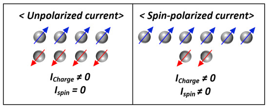Illustration comparing an unpolarized current and a spin-polarized current.