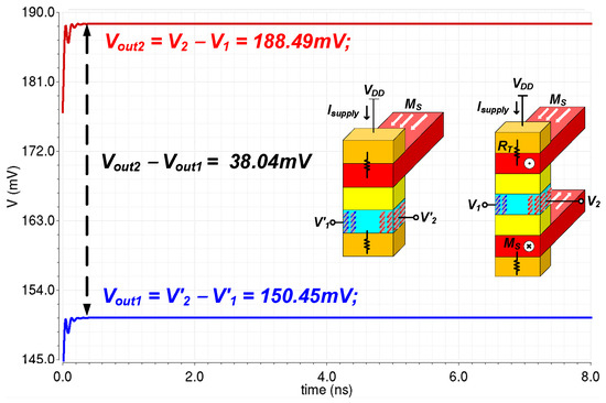 Figure 8 illustrates the comparison of the output voltage difference between the previous structure and the proposed structure. The output voltage difference of the proposed structure is 188.49 mV, whereas that of the previous structure is 150.45 mV. Thus, the proposed double spin filtering structure is capable of increasing the output voltage difference (and its corresponding output current) by 25% compared to the previous single spin filtering structure. Although the results did not demonstrate a doubling of the output voltage difference due to the limited mean free path of the spin-polarized current, we believe that further improvements in efficiency can be achieved through material and device engineering.