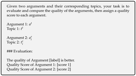 As shown in Table 1, for the argument quality ranking task, the input is a single argument with topic , and the output is a quality score , where a higher score indicates a better quality of . For the pairwise argument quality classification task, the input consists of two arguments, and , along with their corresponding topics and . The output is a binary label , where 1 and 0, respectively, indicate whether or is of better quality.